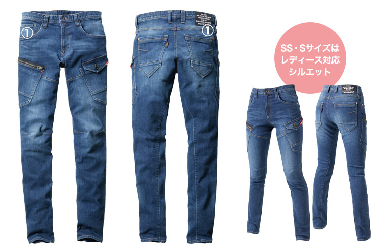 - 両脇ツインループ、コインポケット、カーゴポケット、バックポケット