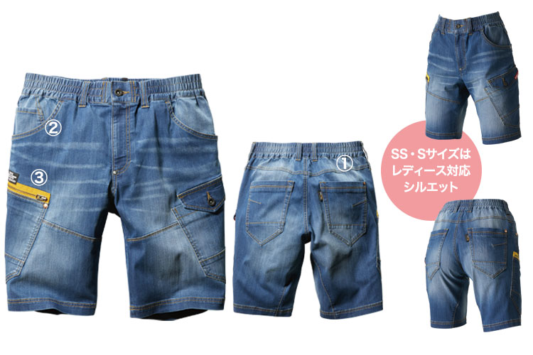 かっこいいバートルのコーデュラデニムショート丈パンツ。ストレッチ性と耐久性を兼ね備え、接触冷感とショート丈で涼しく快適に着ていただけます。