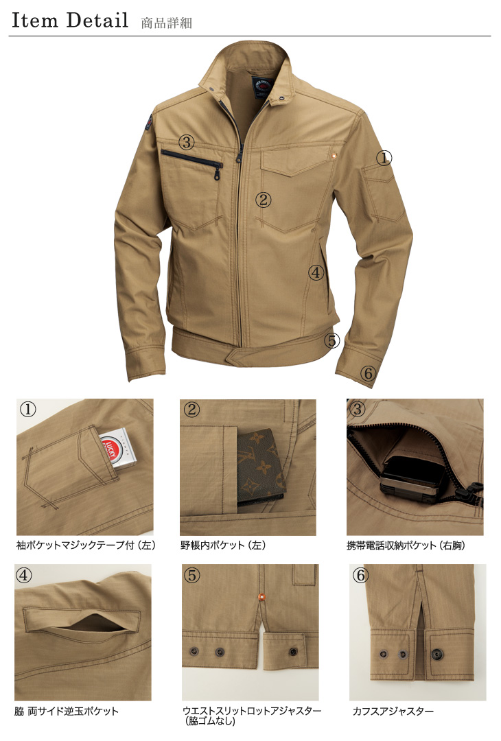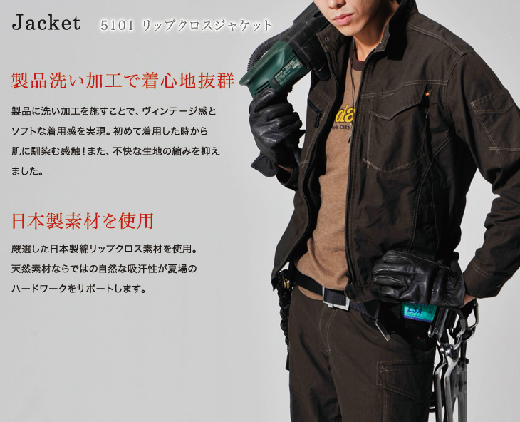 洗い加工が魅力のジャケット。綿100%のやさしい着心地と自然な吸汗性が嬉しい作業服です。
