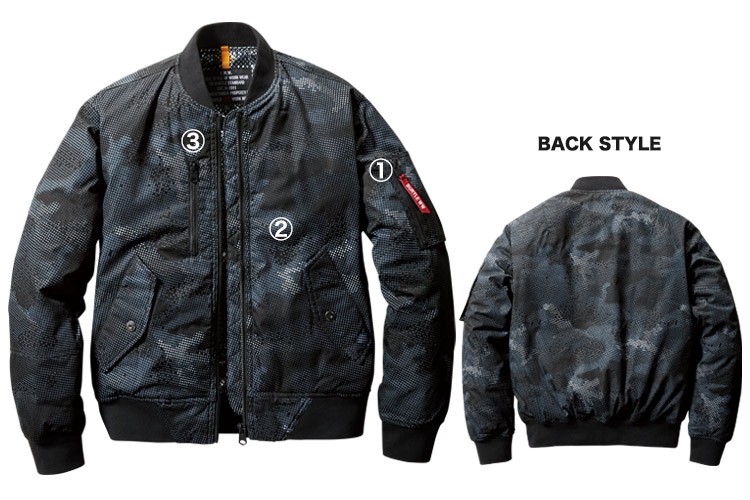 トレンドのMA-1ブルゾンタイプ。おしゃれなデザインが特長の防寒ジャケット。作業中以外の普段使いもできるカジュアルな防寒着です。両脇のポケットは、手を入れると温かいウォームアップポケットになっています。