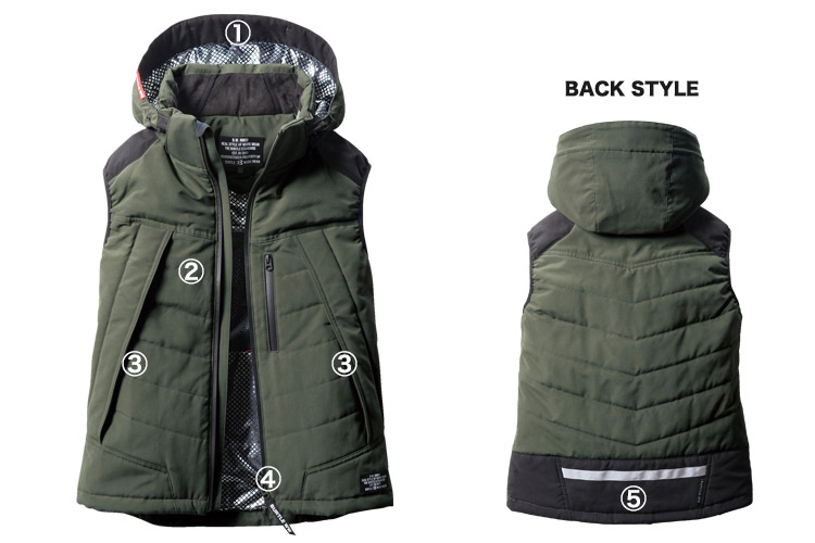 5270シリーズ,防寒ベスト,サーモクラフト対応,男女兼用,ユニセックス,反射材,撥水,銀,シルバー,黒,ブラック,カーキ,アーミカーキ,グリーン,ブラウン,茶色,アーバンブラウン