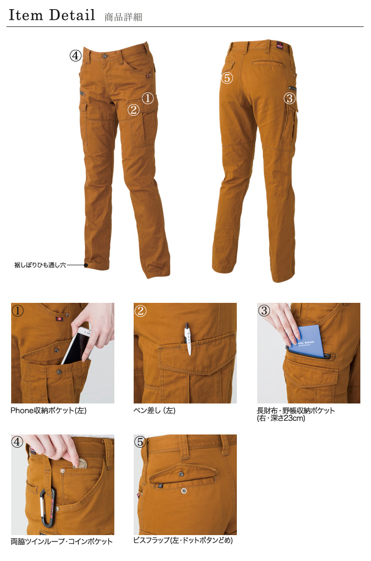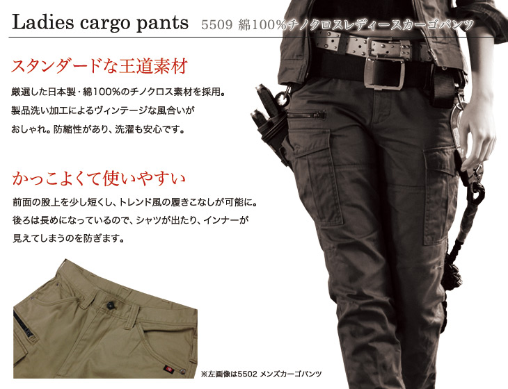バートルの細身シルエットが格好いいローライズタイプの女性用カーゴパンツ。日本製の綿100%素材を使用しているので履きごこちもバツグン!