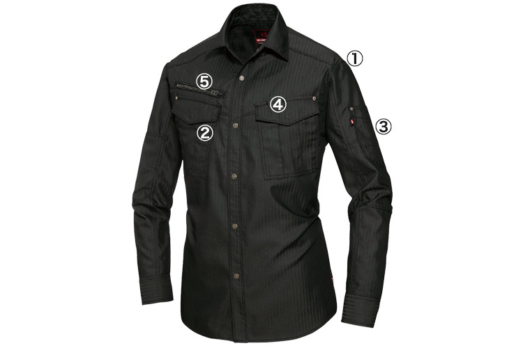 とにかくかっこよくキマるブラックヘリンボーンの長袖シャツ。制電ケア商品なので静電気のいやなパチパチ感を軽減。