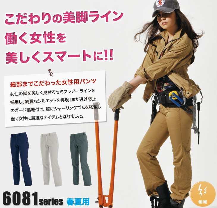 バートルのレディースパンツは、脇ゴムや透け防止のガード裏地付きで脚を美しく魅せるセミフレアーラインを採用。