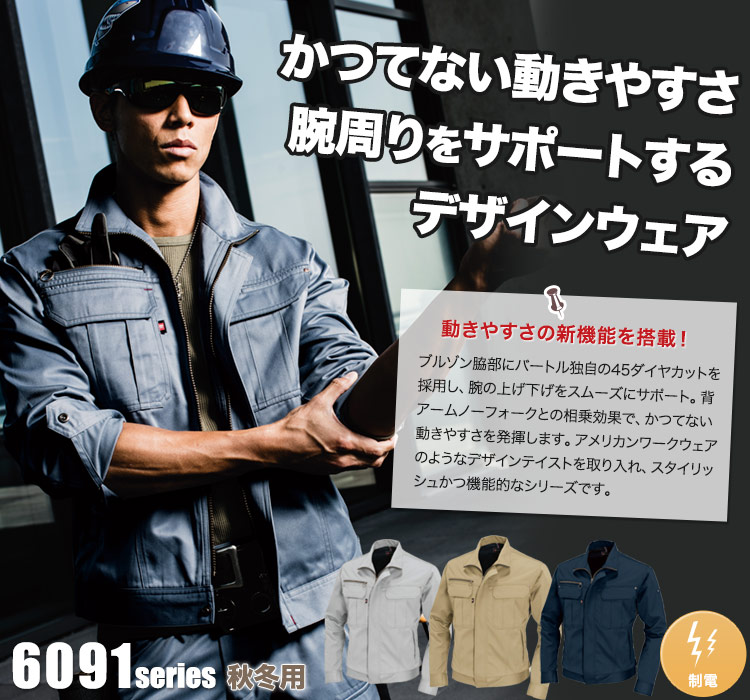 6091シリーズ,バートル,かっこいい,ブルゾン,ジャケット,秋冬用,女性,おしゃれ,制電,男女兼用,帯電防止,運送,倉庫,営業,配達,建築,土木,農業,カーキ,ネイビー,ネービー,ミストブルー,シルバー