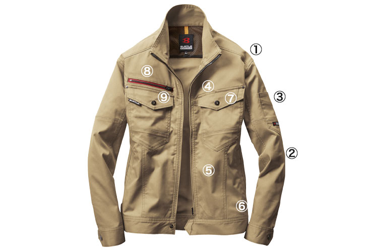 再生糸を用いたエコロジカルなSDGs対応の作業服。身体に程よくフィットするストレッチ生地が心地よいバートルの長袖ブルゾン。