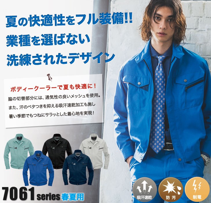 7061シリーズ,おしゃれ,バートル,クロカメ,春夏,長袖ブルゾン,かっこいい,吸汗速乾,防汚加工,脇メッシュ,制電,帯電防止,ロイヤルブルー,シェル,ネイビー,アースグリーン,ブラック