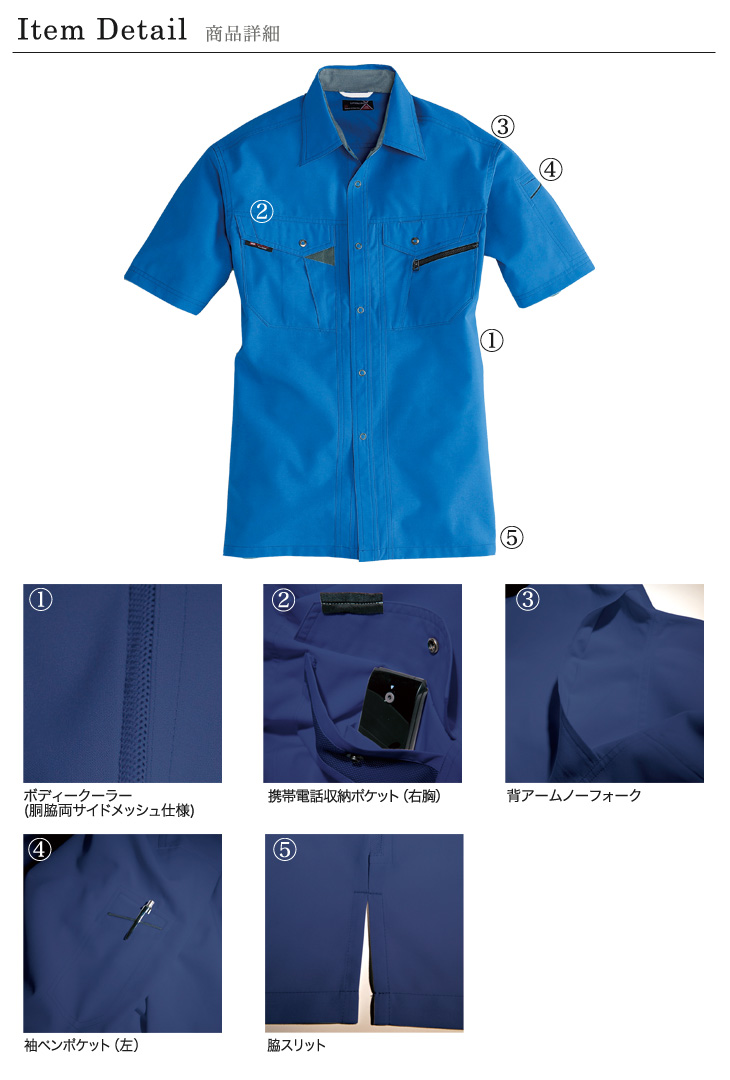 7061シリーズ,おしゃれ,バートル,クロカメ,春夏,半袖シャツ,かっこいい,吸汗速乾,防汚加工,脇メッシュ,制電,帯電防止,ロイヤルブルー,シェル,ネイビー,アースグリーン,ブラック