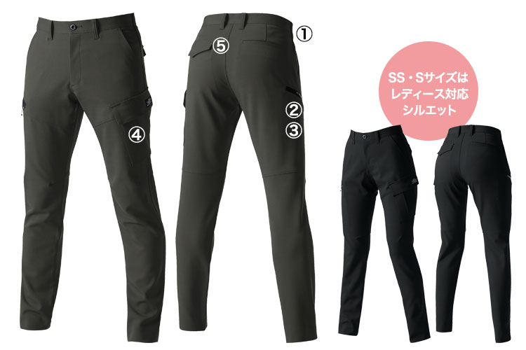 伸長率20%のストレッチ性、JIS T8118適合の帯電防止性、汚れが落ちやすい吸水防汚加工と、多機能なカーゴパンツ。程よく細身なシルエットでシンプルながらも洗練されたデザインとお手頃な価格設定で、企業ユニフォームとしての採用におすすめです。