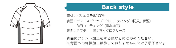 - ポリエステル100% (表地:デュースポリップ、PUコーティング(防風・保温)、WRコーティング(撥水加工) 裏地:タフタ、マイクロフリース(背面) 脇:マイクロフリース)