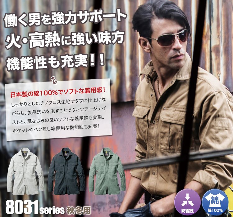 作早2015AW,8031シリーズ,おしゃれ,バートル,クロカメ,秋冬用,かっこいい,カジュアル,綿100%,長袖シャツ,防縮性,製品洗い加工,アースグリーン,クーガー,シルバー,キャメル,鉄鋼,機械,溶接,建築,建設