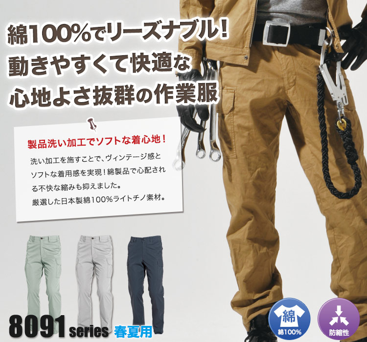 8091シリーズ,おしゃれ,バートル,クロカメ,春夏用,かっこいい,カジュアル,綿100%,カーゴパンツ,防縮性,製品洗い加工,クーガー,シルバー,キャメル,アースグリーン,鉄鋼,機械,溶接,建築,建設