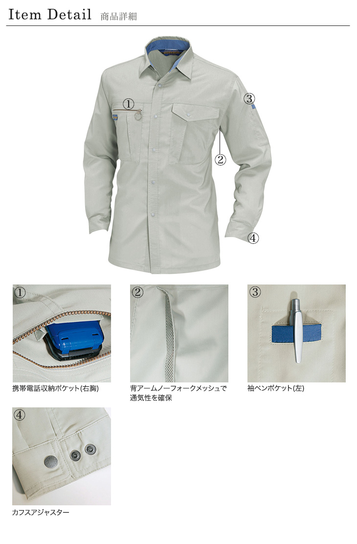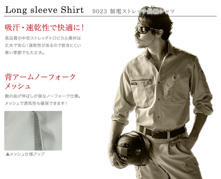 ストレッチ性とノーフォークメッシュが作業をスムーズにサポート。オールシーズン使える長袖作業シャツ。