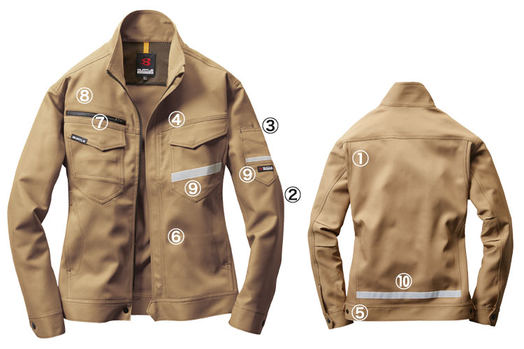 高いストレッチ性のあるJIS T8118適合のバートルストレッチツイルジャケット。暗所や夜間での作業も安心の反射材(リフレクター)付き。