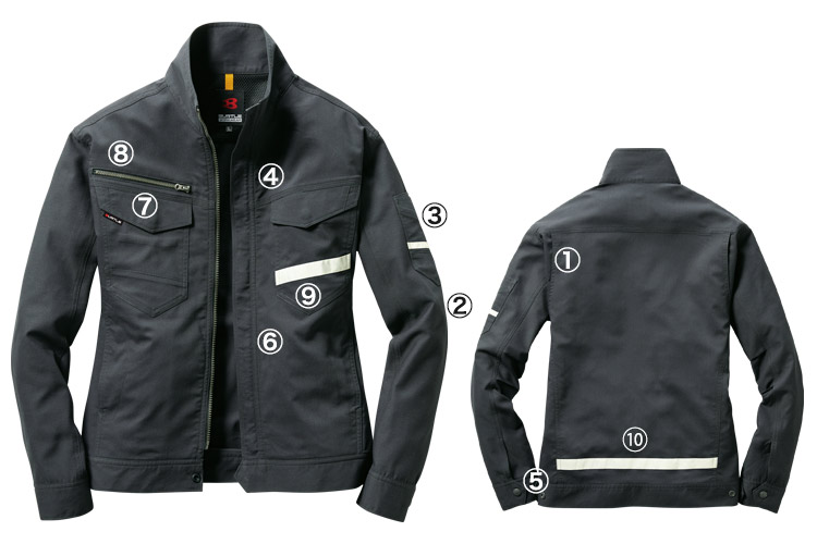 バートルの制電防止の長袖ジャケット。ストレッチ性、吸汗速乾性もあり、劣化も少ない作業服です。