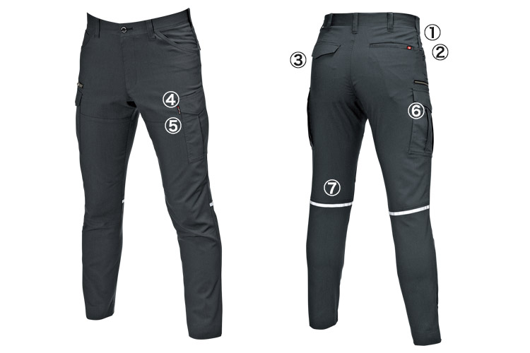 バートルの制電防止カーゴパンツ。ストレッチ性、吸汗速乾性もあり、劣化も少ない作業服です。