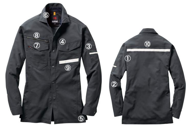ストレッチが効いたバートルの制電シャツ。腕の後ろ部分はメッシュ素材で蒸れにくく快適です。