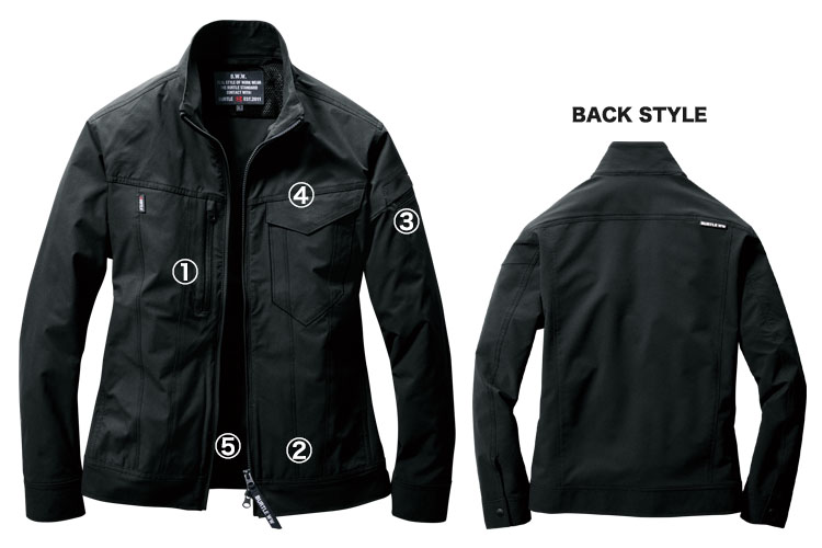マットな質感と細身なシルエットがかっこいいバートルのジャケット。上下左右へ自在に伸縮する4方向ストレッチが効いて、軽さとともにストレスフリーな着用感。JIS T8118適合の帯電防止です。