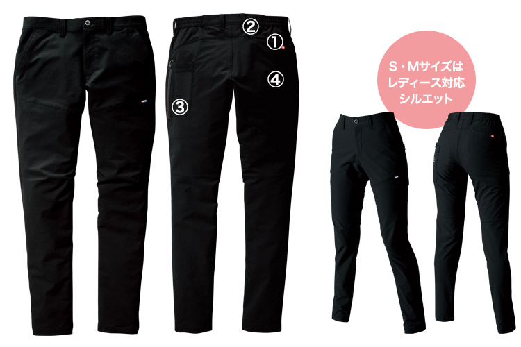 S・Mサイズは女性でも美しく着こなせるレディースシルエット(ユニセックス)対応!細身なテーパードシルエットで、男女ともに選んでいただけます。様々なワークシーンに合わせて楽しめる作業服シリーズです。