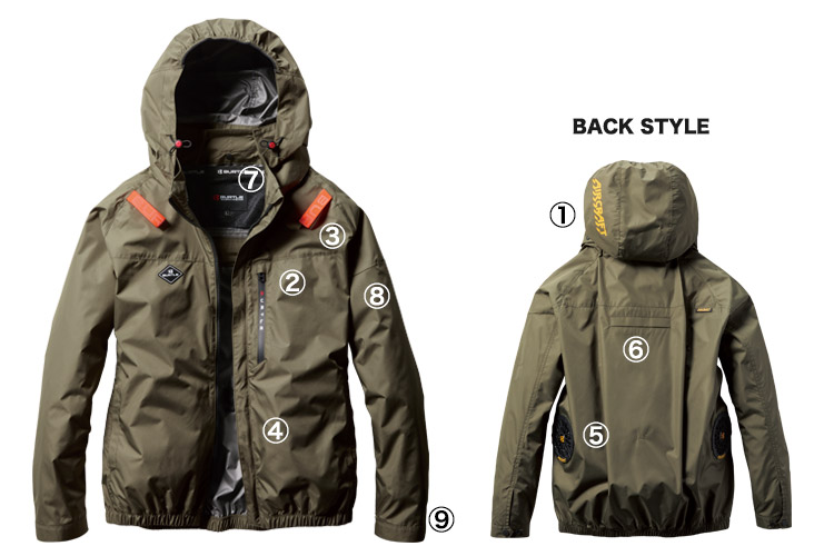 - フルハーネス対応、両脇サイドファン、ファスナーポケット、大型フード