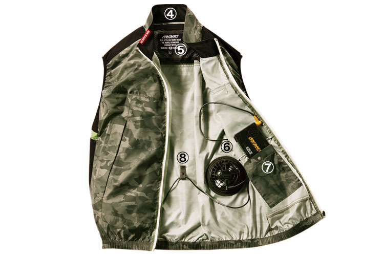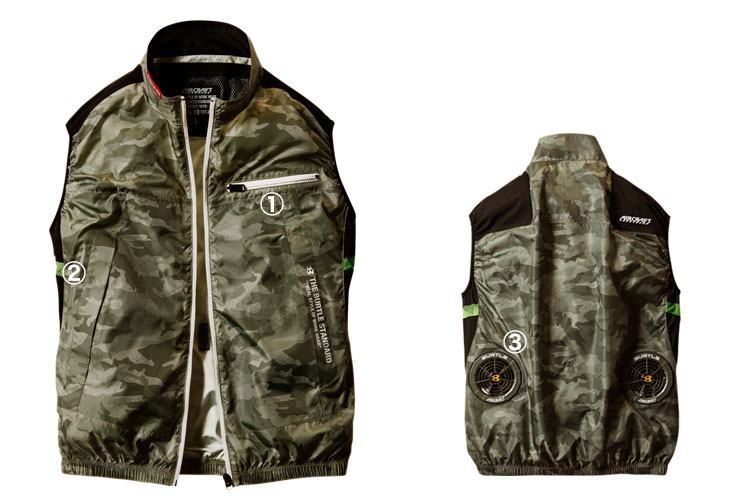 バートルのファン付き作業服のベスト。保冷剤が後ろ首元に入るポケットや、襟元に吸汗ニットを採用するなど、細かい機能が満載!