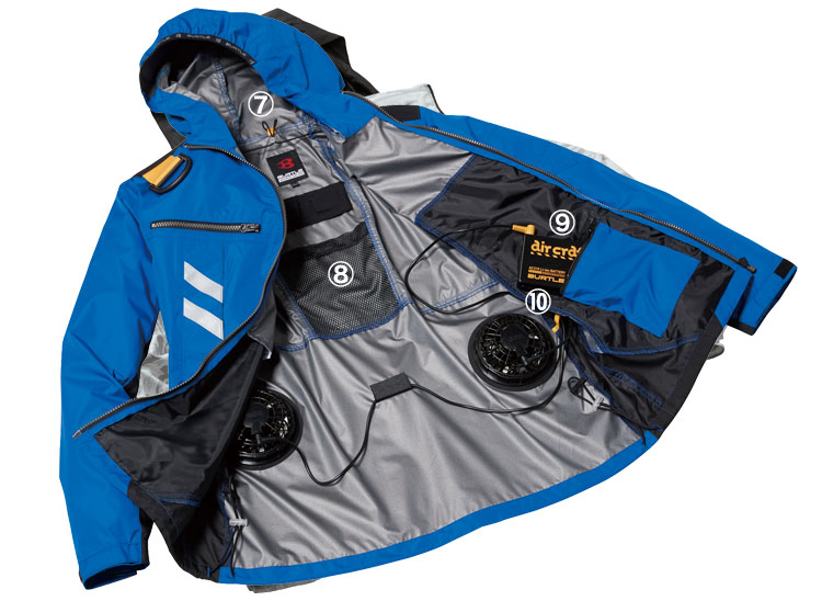バートルが開発したair craftはワークジャケットに電動ファンを装着。衣服内に空気を取り入れて循環させることで、体表面の汗が蒸発、その気化熱で身体を冷やして清涼な着心地を提供します。