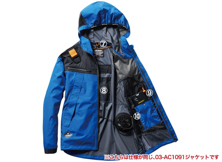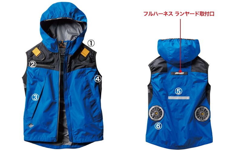 高所作業時のフルハーネスに対応のファン付き作業着。両肩に収納も可能な安全帯フックハンガー付き。