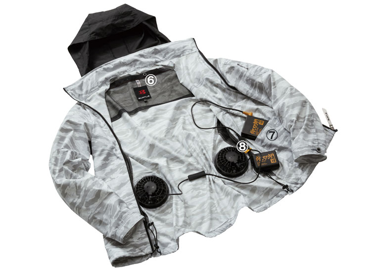 バートルのかっこいいファン付き作業服とデバイスのセット。収納式フードやペン差しなど嬉しい機能もあります。