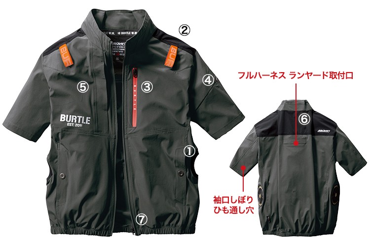 フルーハーネス対応で、おしゃれなバートルエアークラフト半袖ブルゾン。耐久性のあるコーデュラ素材でさらにストレッチが効いています。注目は、ファンが後ろではなく両脇に付いたサイドファンタイプ!