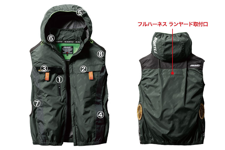 - フルハーネス対応、両脇サイドファン、ファスナーポケット、大型フード
