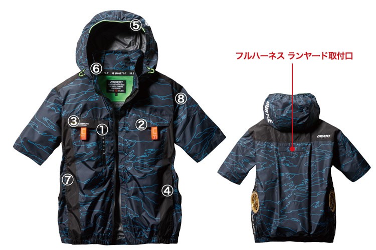 - フルハーネス対応、両脇サイドファン、ファスナーポケット、大型フード