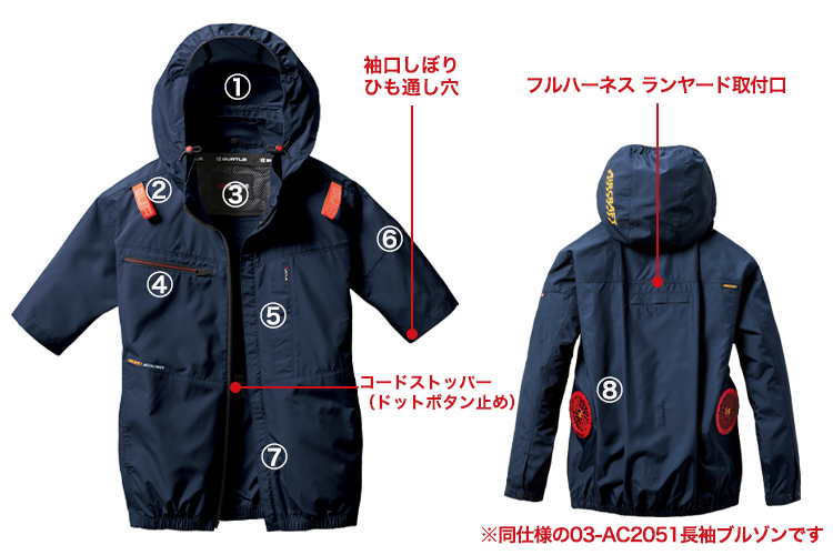 - 防風加工、撥水加工、エコ、軽量、フルハーネス対応