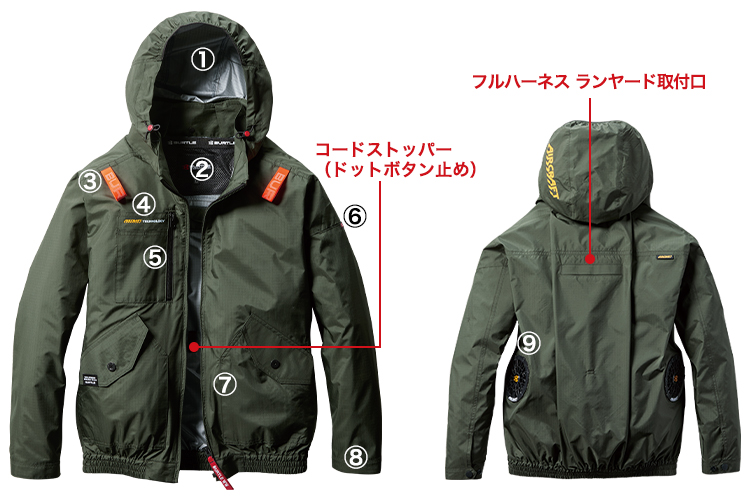 - フルハーネス対応、サイドファン、ファスナーポケット、大型フード