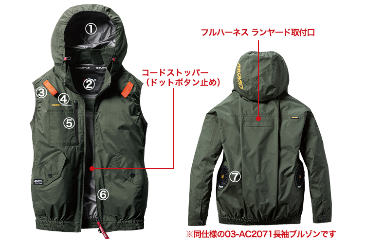 - フルハーネス対応、サイドファン、ファスナーポケット、大型フード