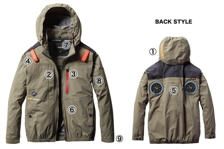 - フルハーネス対応、ハイバックファン、ファスナーポケット、大型フード