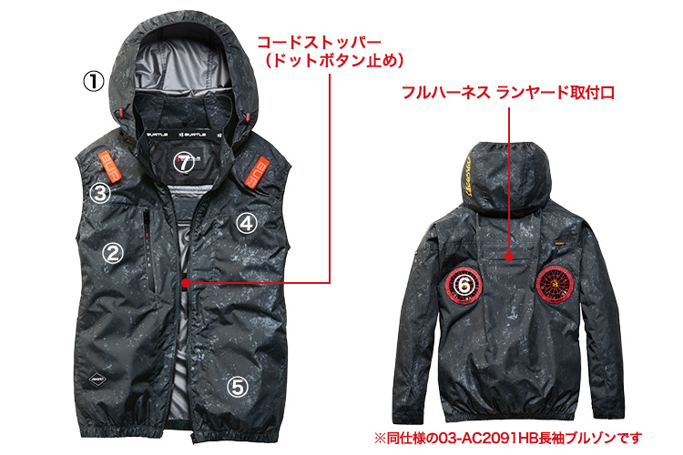 - フルハーネス対応、ヘルメット収納フード(着脱可能)、ハイバックモデル