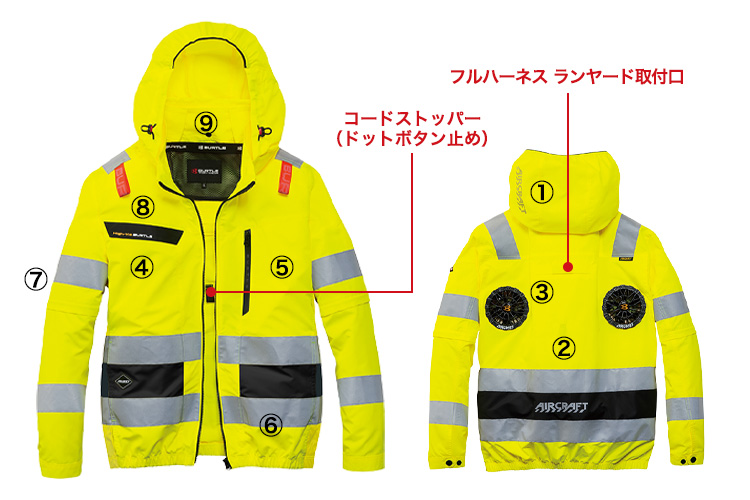 360°反射材を備え、JIS T8127規格に適合した高い視認性で安全性に配慮しています。また、袖の取り外しが可能で、長袖・半袖の2wayで着用できる高い汎用性も魅力。ハイバックファン仕様でフルハーネスにも対応し、建設現場やトラックドライバーなどの現場作業に最適です。さらに、引き裂きに強く耐久性にも優れた軽量設計となっています。