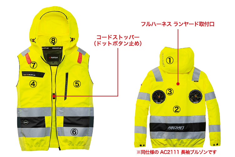 360°反射材を備え、JIS T8127規格に適合した高い視認性で安全性に配慮しています。ハイバックファン仕様でフルハーネスにも対応し、建設現場やトラックドライバーなどの現場作業に最適です。さらに、引き裂きに強く耐久性にも優れた軽量設計となっています。