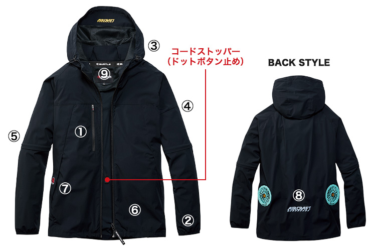 バートルが開発したair craftはワークジャケットに電動ファンを装着。衣服内に空気を取り入れて循環させることで、体表面の汗が蒸発、その気化熱で身体を冷やして清涼な着心地を提供します。