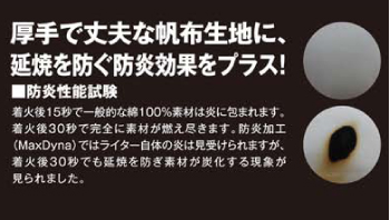 - 綿100%帆布(MAX DYNA使用)防炎素材 ボタンは金属製使用。