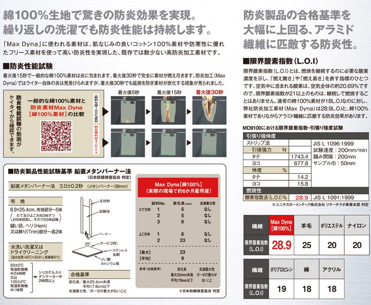 防炎性能試験の動画が視聴できます。 一般的な綿100%素材は着火後30秒で燃え尽きますが、 防炎加工商品(MaxDyna)は延焼を防ぎ素材が炭化する現象が見られます。