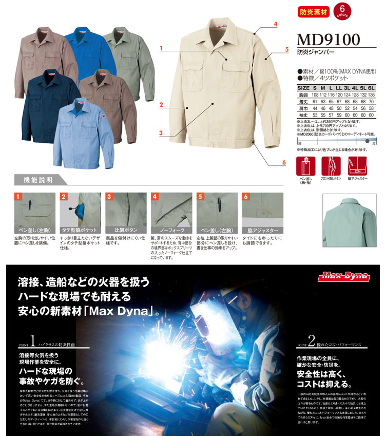 「MaxDyna」に使われる素材は、肌なじみの良い綿100%素材や、防寒性に優れたフリー素材を使って高い防炎性を実現した、既存では数少ない高防炎加工素材です。