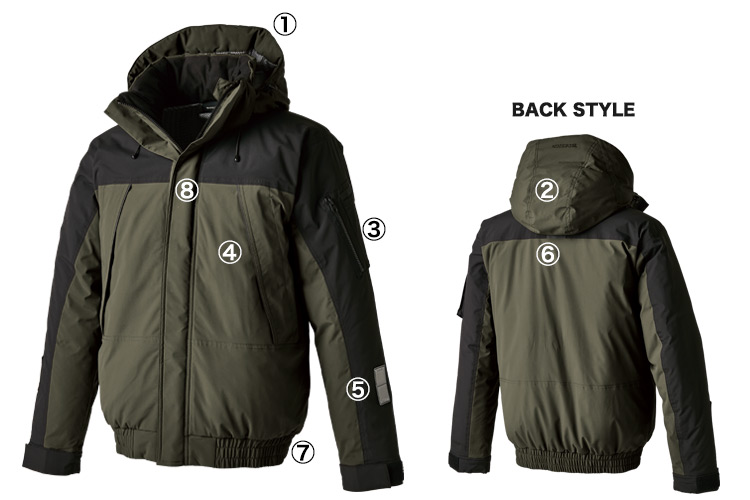 - 平均重量(Lサイズ)900g、両側内ポケット付き、両胸ファスナーポケット、左袖ファスナーポケット、取り外し式フード