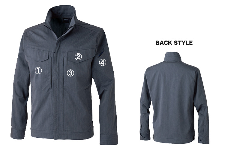 - 平均重量(Lサイズ)390g、ネームホルダーループ、マルチスリーブポケット、左胸縦ファスナーポケット、両胸フラップポケット、両脇ポケット