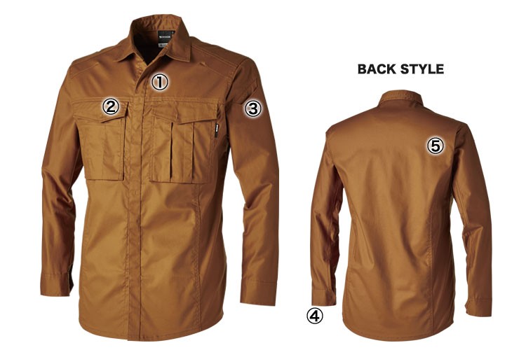 綿素材が必要とされる現場でも着用いただけるよう、フロント箇所の前立て仕様と両胸ポケットをフラット仕様にし、火の粉対策の対応をしています。また、男女兼用で落ち着いたカラー展開のため、企業様の導入にもおすすめです。