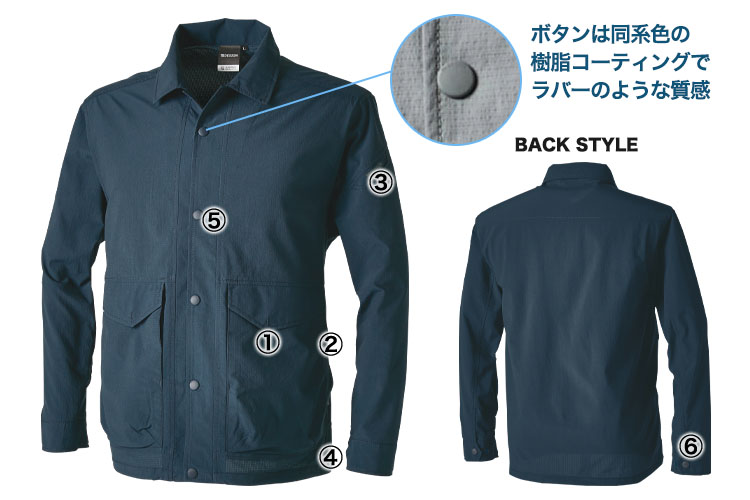 超軽量素材に加え、ボタンに樹脂素材を使用しているので軽量性がアップ!軽い着用感なので疲れにくく、内勤業務や製造業、営業の方にもおすすめのジャケットです。