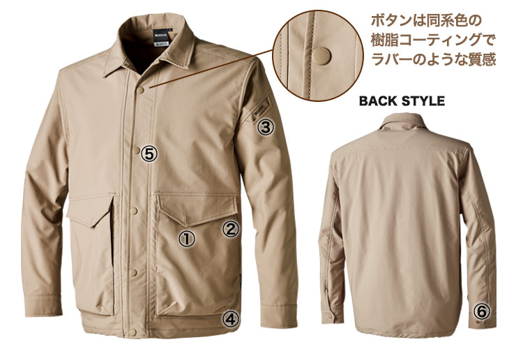 表面はポリエステル生地ながらザラつきを抑えて、ナイロン調のマット感を演出したかっこいい仕上がり。表面がフラットでツルッとしているので、ホコリがつきにくくお手入れも簡単。そして軽くて疲れにくい。ボタンは生地と同系色でこちらもマットさを感じるこだわりの樹脂製です。