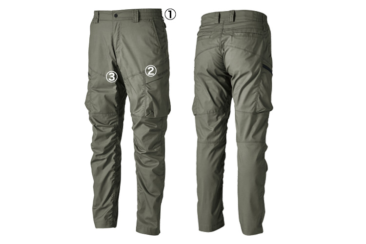 - 平均重量(Lサイズ)420g、両脇ウエストゴム仕様、左ポケットフラップ仕様、右ポケットファスナー仕様