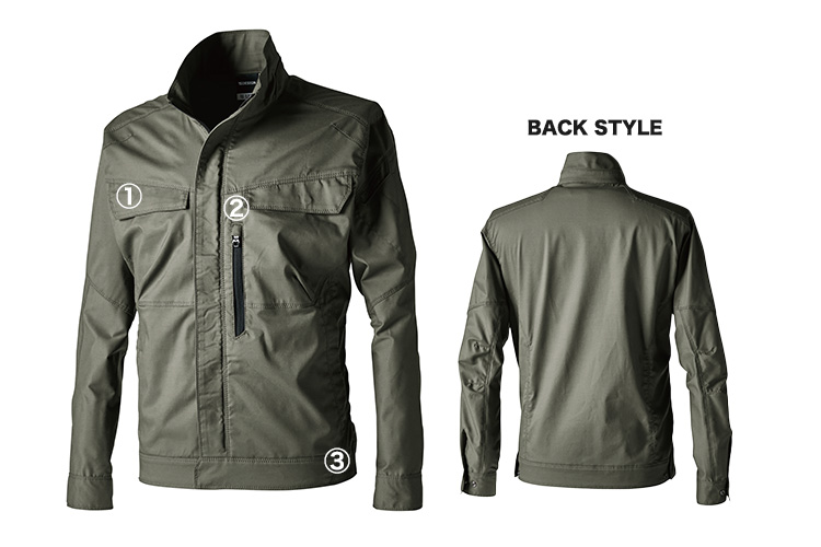 - 平均重量(Lサイズ)490g、左胸縦ファスナーポケット、両胸フラップポケット