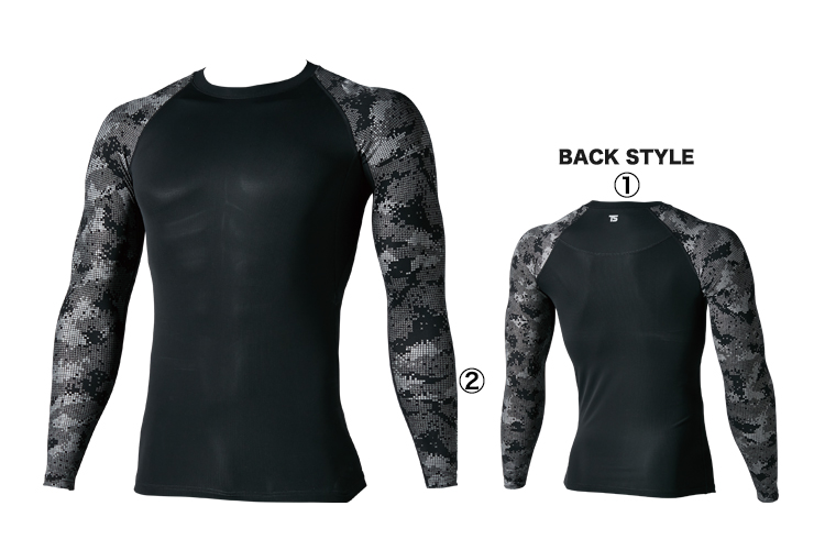 TS DESAIGN独自開発の全身消臭機能で汗をかいても臭わせず、特殊な遮熱プリント「メガクール」による高い遮熱効果のあるコンプレッション。凹凸のあるメッシュ構造で優れた通気性を備えた、暑い夏の現場にうれしい一着。